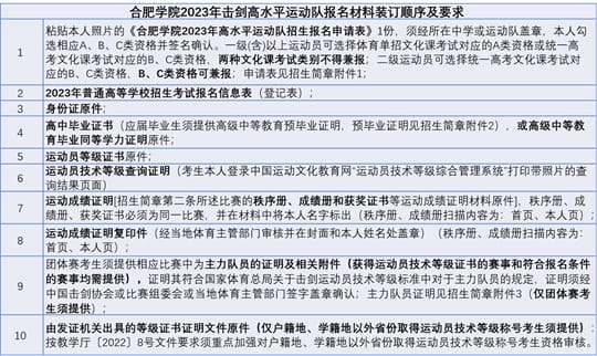 符合我校报名条件的所有考生,须提供按以下材料清单提供原件,同时将原件扫描后按目录顺序编号制成1个PDF文档,并命名为“生源省份+运动员姓名+统一高考考生号+合肥学院击剑高水平运动队报名材料”(例:安徽省张**2334***合肥学院击剑高水平运动队报名材料):